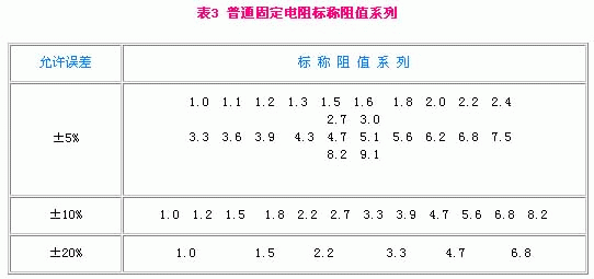 国家规定出一系列的阻值作为产品的标准。不同误差等级的电阻有不同数目的标称值。误差越小的电阻,标称值越多。表2是普通电阻的标称阻值系列。表3中的标称值可以乘以10、100、1000、10k;100k;比如1.0这个标称值,就有1.0Ω、10.OΩ、100.OΩ、1.0kΩ、10.0kΩ、100.0kΩ、1.0MΩ;10.0MΩ;